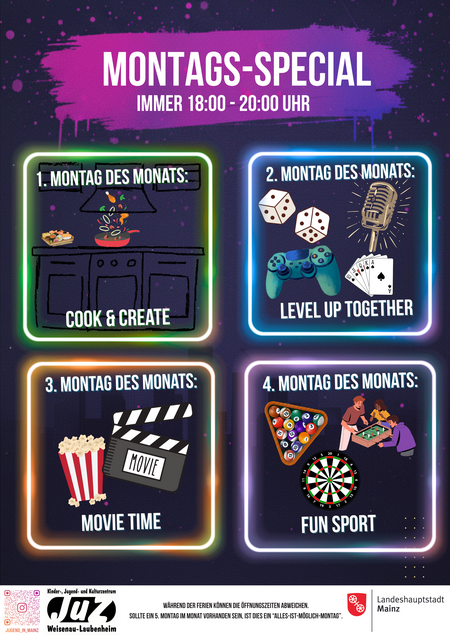 Montags wird von 18:00 - 20:00 Uhr gemeinsam gekocht, gezockt und gechillt. Ob leckere Pasta, spannende Filme oder ein Actionfilm - hier ist für alle was dabei!